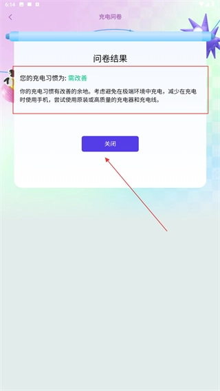 4、查看【问卷结果】(若充电习惯有待改善),在获取优化建议后,点击【关闭】按钮退出结果页面。