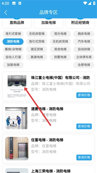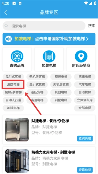 进入【品牌专区】后,选择【消防电梯】分类,系统将呈现对应的电梯品牌及相关产品信息。