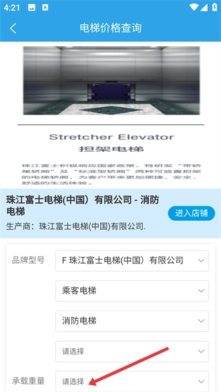 4、在【电梯价格查询】页面,选择【承载重量】等参数选项,补充查询所需信息,以便获取精准的价格内容。