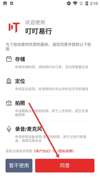 使用【叮叮易行】时,需同意其【存储】【定位】等权限申请,阅读【用户协议】和【隐私政策】后,点击【同意】按钮即可继续操作。
