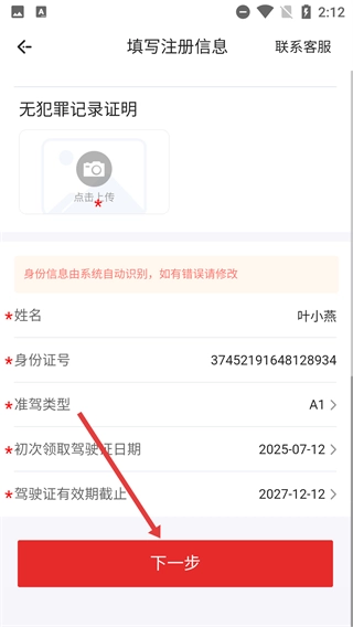 4、进入【填写注册信息】页面,上传【无犯罪记录证明】,确认身份等信息准确无误后,点击【下一步】按钮,即可完成注册信息的填写。