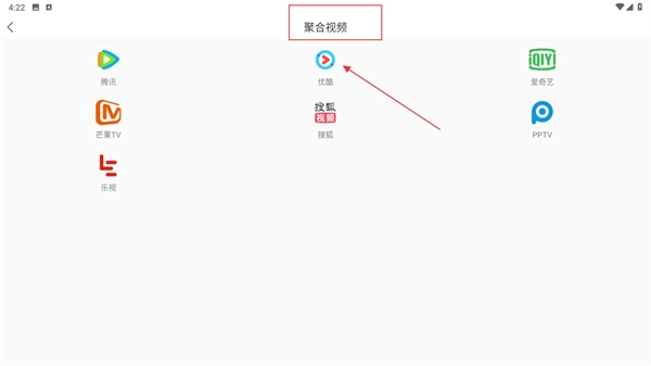 2、进入聚合视频页面后,找到目标平台(例如优酷),点击其对应的平台图标,即可进入该平台的视频内容页面。
