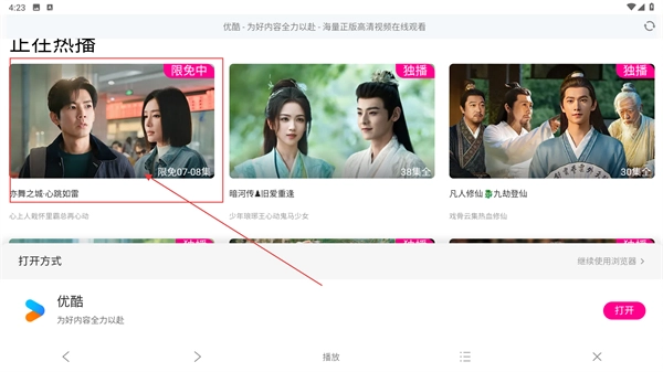3、打开优酷内容页面,找到想要观看的剧集(例如《亦舞之城·心跳如雷》),点击该剧集的封面图,即可进入播放选择界面。