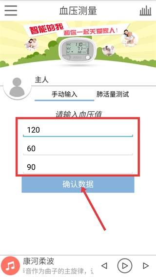 2、把收缩压、舒张压、脉搏的数值填写完整后,点击“确认数据”按钮,提交已输入的健康数据。