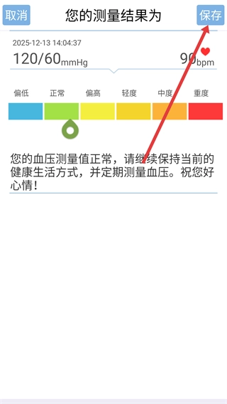 3、在测量结果页面查看血压状态评估内容后,点击“保存”按钮,记录本次血压测量的数据。