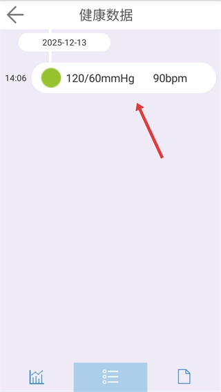 4、进入健康数据页面后,能查看当天已保存的血压和脉搏测量记录,还可以获取相应的历史健康数据信息。