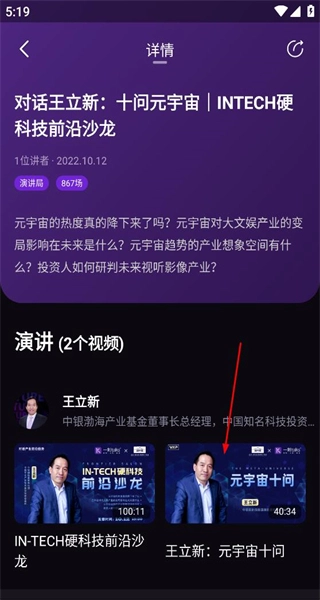 4、进入详情页面后,浏览演讲的相关介绍内容,找到对应的视频选项,即可选择观看相关的演讲视频。