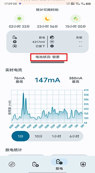3、此外,你还能在“放电”页面查看电池的状况以及实时电流输出情况。