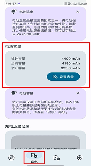 2、点击底部菜单栏的“充电”按钮进入相关页面,接着在该页面向下滑动,找到电池容量相关选项,就能查看电池的出厂容量以及预估容量(即电池寿命)。