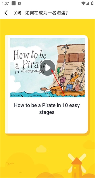4、点击“如何成为一名海盗”绘本进入学习页面,点击播放按钮,即可学习该绘本的英语内容,轻松掌握英语知识。