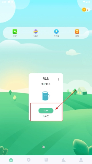 2、进入功能主界面后,找到目标行为(例如“喝水”)对应的卡片,点击【打卡】按钮,即可启动该行为的记录流程。