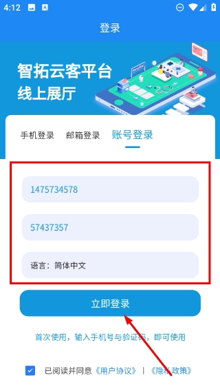 3、进入账号登录界面后,先依次输入账号(例如1475734578)和密码,接着勾选同意相关协议的选项,最后点击【立即登录】按钮。