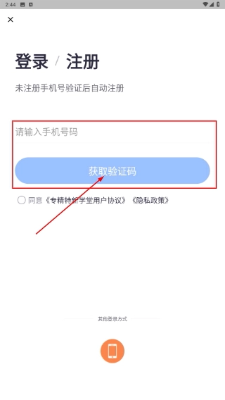 4、在登录/注册页面,填写【请输入号码】,点击【获取验证码】,勾选协议后完成验证,即可完成账号注册并登录。