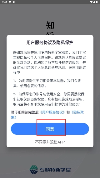 1、当《用户服务协议及隐私保护》窗口弹出后,请仔细阅读相关条款,随后点击【同意】按钮,完成协议确认步骤,即可进入应用。