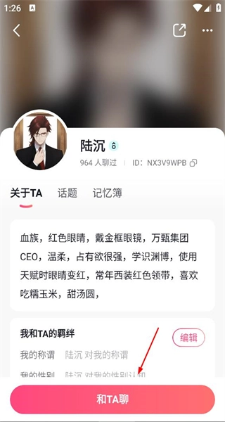 3、进入陆沉的角色界面,呈现他身为血族CEO的特质与爱好,点击界面底部的“和TA聊”按钮,即可开启与陆沉的对话。