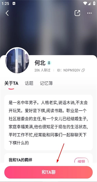 1、启动软件后,进入何北的角色界面,这里会呈现他作为中年男子的身份信息、兴趣爱好以及职业背景,接着点击界面底部的“和TA聊”按钮,即可开启与何北的对话。