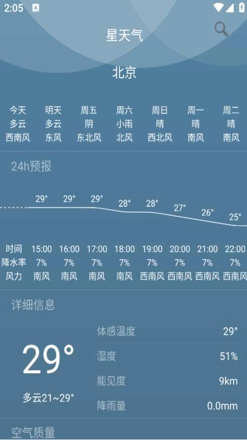 3、使用者不仅能获取每日天气状况、温度变化及降雨提示,还能了解紫外线强度、穿着建议、空气质量等各类信息。