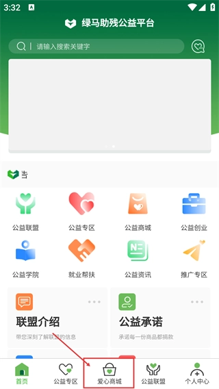 1、在【绿马助残公益平台】首页,点击底部的【爱心商城】按钮,该页面包含【公益联盟】-【公益专区】等多个功能板块。