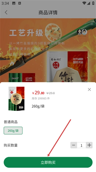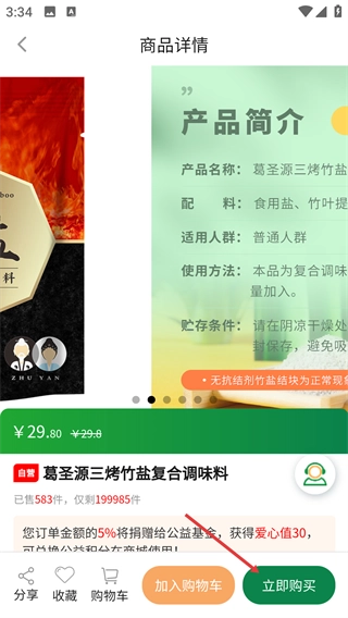 3、进入【葛圣源三烤竹盐复合调味料】的详情页面后,您所支付的订单金额中,有5%会被捐赠用于公益事业,您可以点击【立即购买】按钮来继续后续的购买流程。