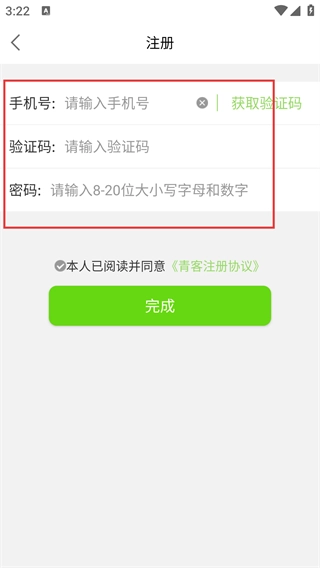 4、进入注册界面后,依次填写【请输入号】、【验证码】和【密码】,勾选【青客注册协议】,最后点击【完成】按钮即可完成注册。