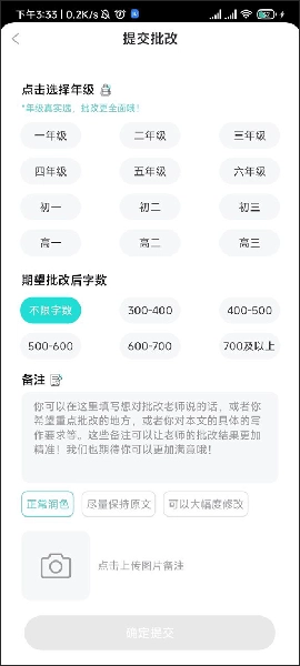 4、接着选择自己的年级以及期望批改后的字数,把这些信息都填写完毕后,点击确定提交,就会有老师在线上进行批改了。