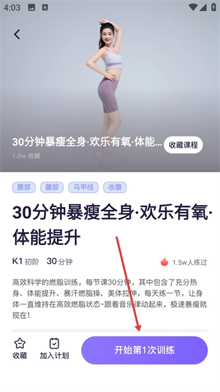 4、进入课程详情页面后,点击【开始第1次训练】按钮,就能开启该课程的训练流程,按照指引完成锻炼。
