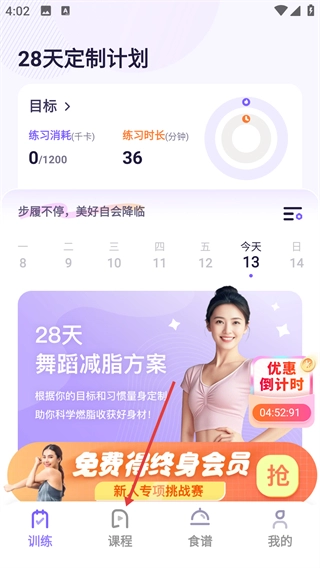 1、在【28天定制计划】页面,点击底部的【课程】选项,进入课程推荐界面,查看适配的训练内容。
