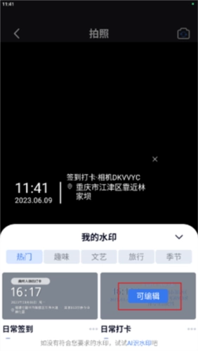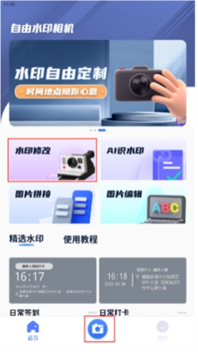 1、可点击界面上标注的水印区域进行修改,也能先进入拍照模式,再切换到功能页面。