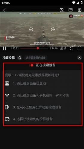 在“正在搜索设备”的过程中,当搜索到设备后,选择对应的设备即可进行投屏操作。