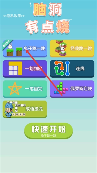 1、进入界面后,找到【脑洞有点烧】板块下的【兔子跳一跳】,点击【快速开始-兔子跳一跳】即可进入游戏,同时也能查看【经典跳一跳】等其他可选项目。