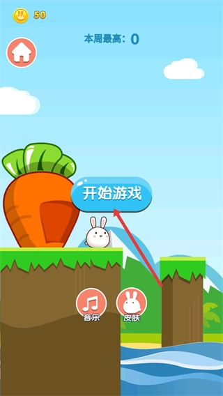 2、进入对应界面后,能看到【50】的数值以及【本周最高-0】的显示,点击【开始】按钮即可启动关卡,同时还可以通过【音乐】和【皮肤】选项来调整相关设置。