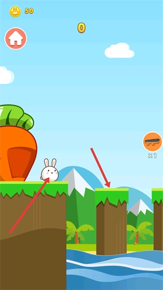 3、在操作过程中,控制兔子跳上平台,借助【滑板-x1】道具来辅助,注意观察上方【0】的数值变动情况,防止兔子掉落到下方区域。