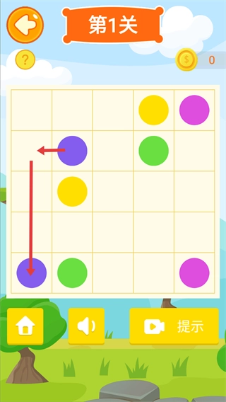 4、在连线【第1关】的网格界面里,按照箭头的指示移动对应颜色的球,要是遇到困难,可以点击【提示】按钮来获取指引,从而推进关卡。