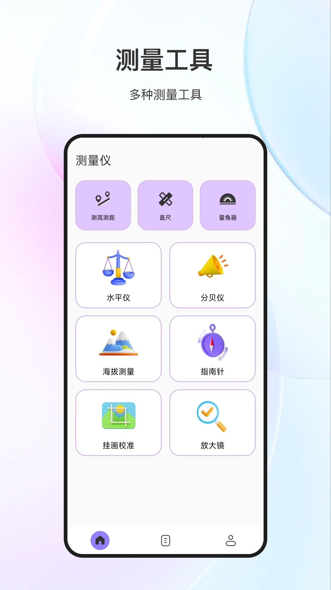 3、多功能测量工具箱,集成了长度测量、角度测量、水平测量、海拔测量、经纬度测量等实用功能,满足你多样化的测量需求。
