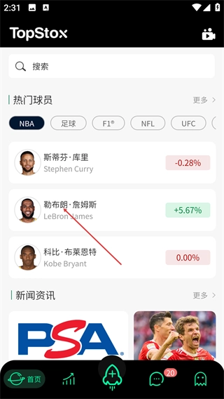 1、进入【TopStox】首页后,可通过【NBA】【足球】等分类板块查看【热门球员】列表,点击想要了解的目标球员即可进入其详情页面。
