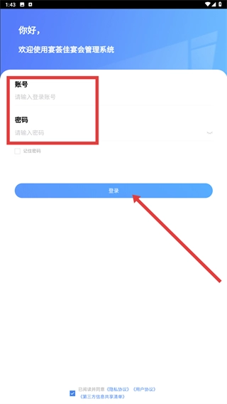 1. 请先阅读《隐私协议》《用户协议》《第三方信息共享清单》,之后点击【同意】按钮,确认接受相关条款即可进入宴荟佳宴会管理系统。