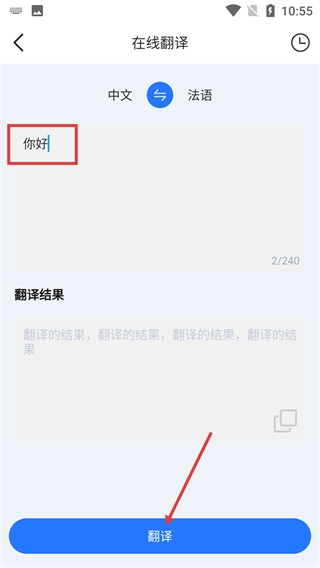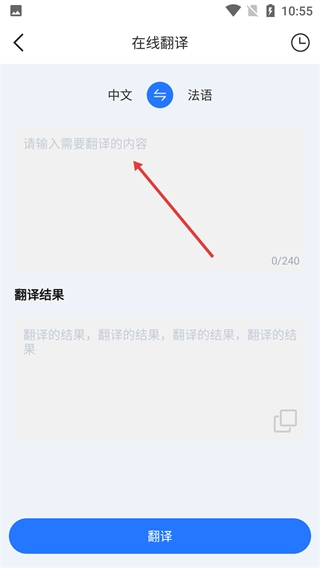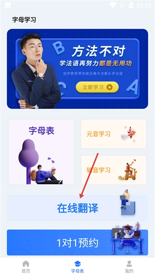 1、在字母学习页面找到并点击【在线翻译】模块,即可进入支持中法互译的在线翻译功能页面。