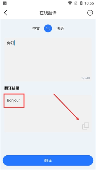 4、翻译完成后,可在翻译结果区域查看对应的法语译文【Bonjour.】,从而完成中法内容的翻译。
