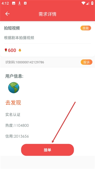 2、在需求页面,挑选目标需求(例如“拍短视频”),点击它对应的“接单”按钮,即可进入该需求的详情页面。
