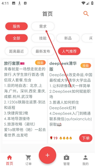 1、打开首页后,点击“需求”标签,即可切换到需求板块页面。