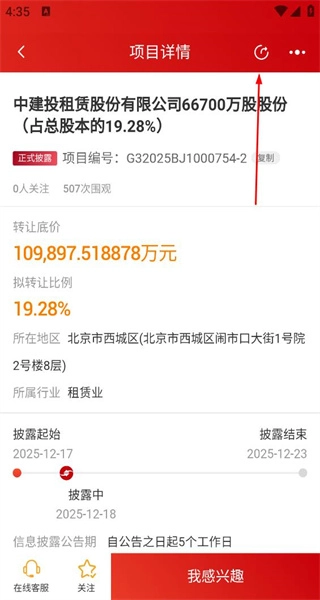 3、进入项目详情页,查看项目转让底价等相关信息后,点击页面顶部的分享按钮,即可弹出分享选项。