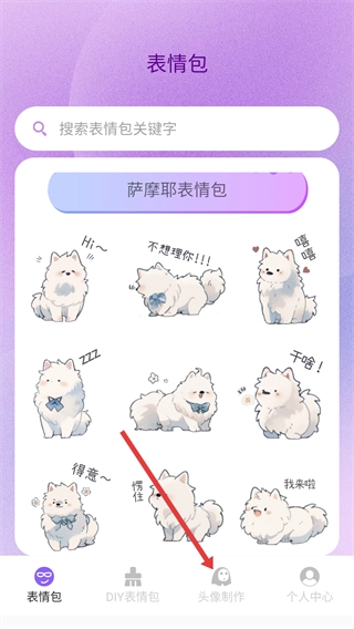 1、进入【表情包】界面后,既可以通过【搜索表情包关键字】来查找相关资源,也能切换到【头像制作】的功能入口,目前界面上展示的【萨摩耶表情包】可供用户选用。