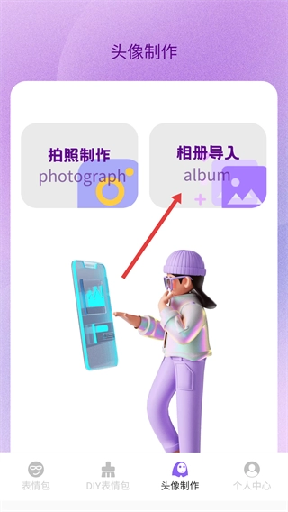 2、进入【头像制作】界面后,可选择【拍照制作-photograph】或【相册导入-album】这两个选项,若点击【相册导入-album】,就能从本地设备中选取素材来进行头像制作。