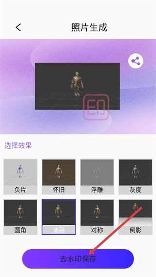 4、在【照片生成】界面选择【油画】等效果样式,完成效果设置后,点击【去水印保存】按钮,即可完成头像制作并保存成果。