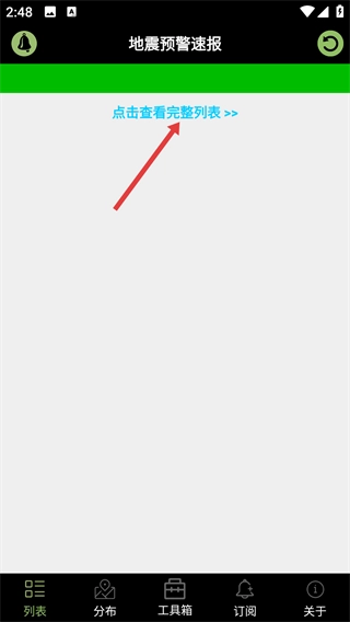 1、在地震预警速报界面,点击“点击查看完整列表>>”选项,即可进入地震信息的完整列表页面。