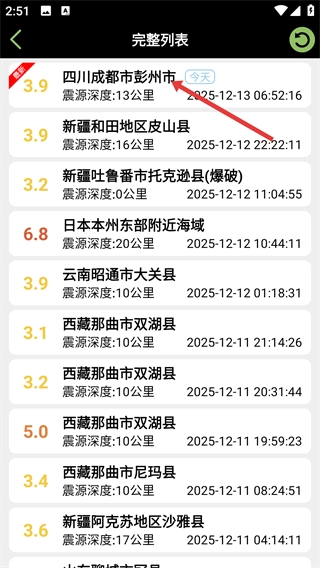 2、在完整列表里,找到并选中目标地震条目(例如四川成都市彭州市的地震信息),点击进入该地震的详情页面。