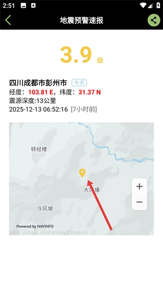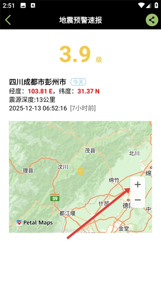 3、进入地震详情页面后,点击地图旁边的“+”按钮,将地图视图放大,以便查看更详细的位置信息。
