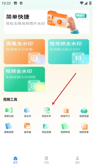 1、在首页的“视频工具”板块,点击【添加文字】选项,即可进入素材选择界面。
