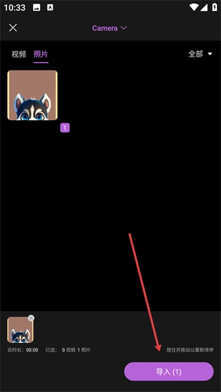 2、在素材选择页面,选定目标图片后点击【导入】按钮,即可进入视频/图片的编辑界面。