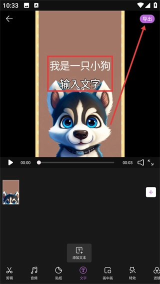 4、在文字输入框中填写内容(例如“我是一只小狗”),填写完成后点击右上角的【导出】按钮,就能保存编辑好的内容。